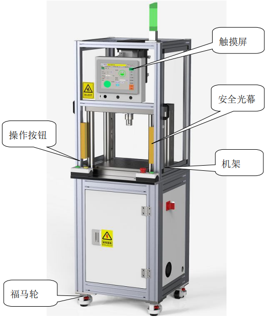 安全防护:设备具备超程、超载、超设定报警功能。采用三色灯柱加蜂鸣器声光报警。配备急 停按钮,在紧急情况时按下急停按钮,设备停止运行并声光报警,避免意外发生。